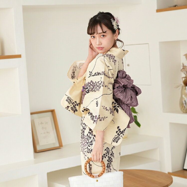 浴衣3点セット (浴衣/帯/下駄) ニコアンティーク フリー(身長155-165cm) 浴衣 セット 高級変わり織り 浴衣 レディース 藤 セット 大人 ベージュ 系 女性 ladies アイボリー 白 青 グレー ふじ 花 フラワー 大正浪漫 レトロ モダン 花火大会 七夕 夏祭り