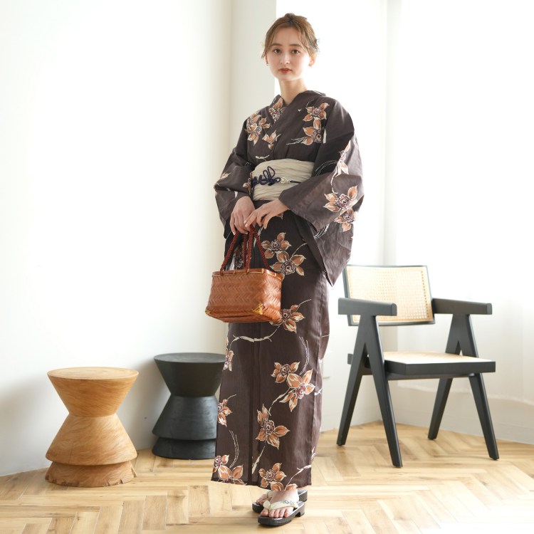 浴衣 セット レディース 浴衣 3点セット(浴衣/帯/下駄)日本製生地 国内染色 日吉染業 ラベンダー ベージュ ブラウン 花 ニュアンスカラー utatane うたたね ウタタネ 浴衣セット ゆかた 女性 レトロ フリーサイズ