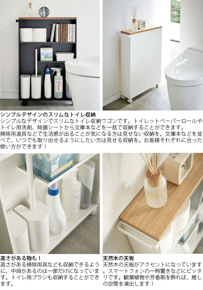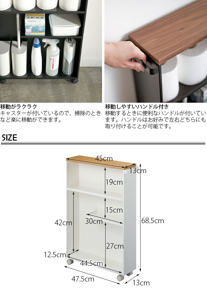 「ハンドル付きスリムトイレラック」は、トイレットペーパーロールやトイレ用洗剤、除菌シートから文庫本などをすっきり一括収納いただけます。